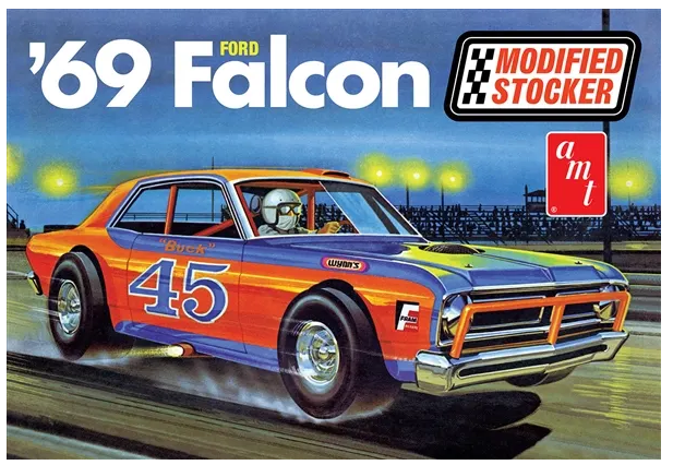 This kit has some great features including a padded roll cage, front bumper braces, bucket seats, exhaust dumps, a 351 Ford engine, pad-printed Goodyear super wide slicks, and an optional short track front tire. It also includes a set of updated colorful waterslide decals and Retro Deluxe™ AMT reproduction packaging.