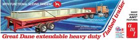 The Kats at AMT are happy to reintroduce the dynamic Great Dane Extendable Heavy Duty Flatbed Trailer! This 1/25 scale beauty, originally created by Ertl, includes over 150 parts molded in white and black and boasts many fine features: adjustable rear suspension, wheels or sand shoes landing gear option, extendable trailer bed, pocketed scuff rails and more! Featuring an all-new decal sheet with “wide load markings”, you can team this trailer up with almost any 1/25 scale big rig tractor for an impressive haulin’ display!