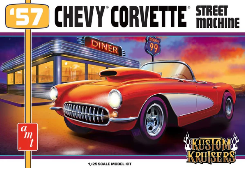 This is an AMT 1498 1:25 Scale 1957 Chevy Corvette Street Machine Plastic Model Kit. Features: 1:25 scale, skill level 2, paint & glue required, 100+ parts, Molded in white, clear, transparent red, and some chrome-plated parts, Black vinyl tires, Built size: 6.5 inches long.