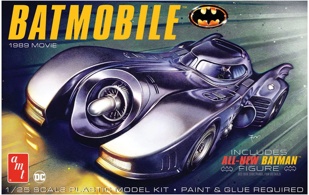 Build the iconic Batmobile from the 1989 Batman movie and now includes an ALL-NEW seated Batman figure. This kit also features a pull-out turbine engine, detailed cockpit & dish, computer access panels in the interior instrument panel, dual machine guns, and an optional grappling hook. Then it’s all wrapped up in AMT's vintage-style packing.