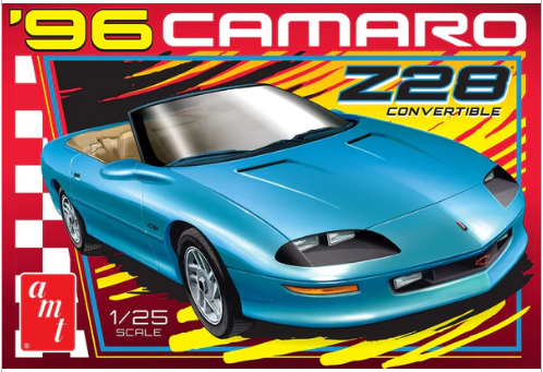 This is an AMT 1495 1:25 Scale 1996 Chevy Camaro Z28 Convertible Plastic Model Kit. Features: 1:25 scale, skill level 2, paint & glue required, 105 parts, Molded in white, clear, transparent red, and some chrome-plated parts, Black vinyl tires, Built size: 7.75 inches long.