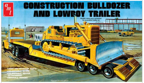 This is a AMT 1218 1:25 Lowboy Trailer & Bulldozer Combo Plastic Model Kit. The Lowboy Trailer & Bulldozer Combo is a dream for detail-oriented modelers. The kit includes 534 authentically-scaled parts overall. It’s molded in two colors and features a colorful decal sheet with optional construction company logos. The beautifully illustrated vintage packaging has been revived for this exciting reissue as well. One of the most unique model kits ever created.