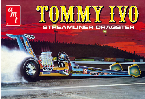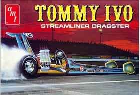 This is an AMT 1254 1:25 Tommy Ivo Streamliner Dragster Plastic Model Kit. Features: 1:25 scale, skill level 2, paint & glue required. 95 parts. Molded in white with chrome parts. Black vinyl tires. Built scale: 10 inches long. Ages 14+.