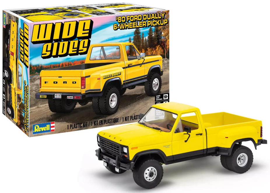 With its mile-wide “dually” bed and high-riding stance, Revell’s “Wide Sides” is an old-school 1980 Ford F-Series six-wheeler pickup that’s full of attitude and ready to take center stage in your model collection. This easy-to-assemble kit from Revell’s archives returns for the first time in decades. Details include a standard cab, a finely detailed grille, and door-mounted oversize mirrors.