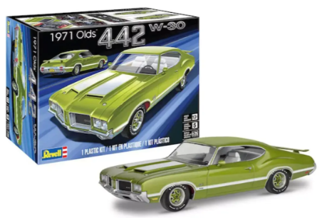 As 1971 dawned the golden era of Detroit muscle was fading, but that year’s Olds 442 W-30 was one of the last true standouts of this exciting period. W-30 denoted the ultimate 442, and it’s the version that Revell choose for this kit. The W-30 performance option package included a specially prepared 455-cube V-8 good for 350 horsepower and a distinctive twin-scooped hood with functional ram air induction, along with bold hood and bodyside stripes.