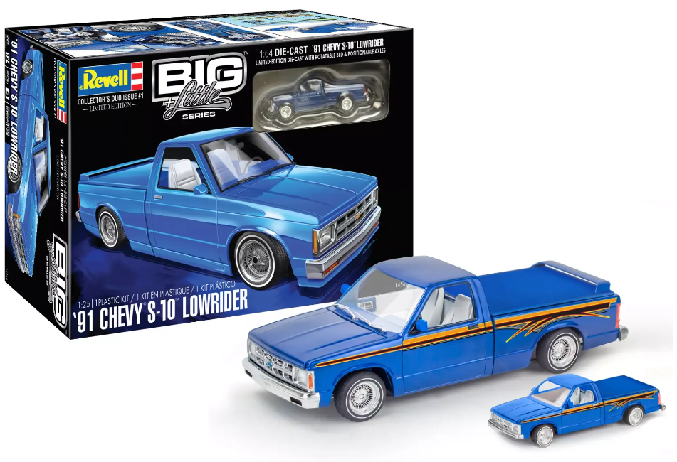Revell’s new Big + Little Series debuts with the 1991 Chevrolet S-10 lowrider and combines an unassembled 1:25-scale plastic model kit with a limited-edition 1:64-scale diecast. Add this don’t miss duo to your collection today!