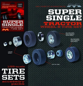 Convert Moebius' International tractors (or others) to "Super Single" wide-track wheels and tires that replace the conventional dual setup. 6 wheels and tires.