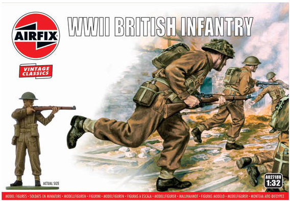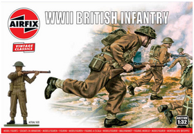 New for 2022, Airfix's 1/32 scale British Infantry figure set. This set of 14 figures features British infantrymen from WWII in a variety of unique poses. They are equipped with iconic British field gear and feature various weapons, such as Enfield rifles, Webley revolvers, and even a mortar!