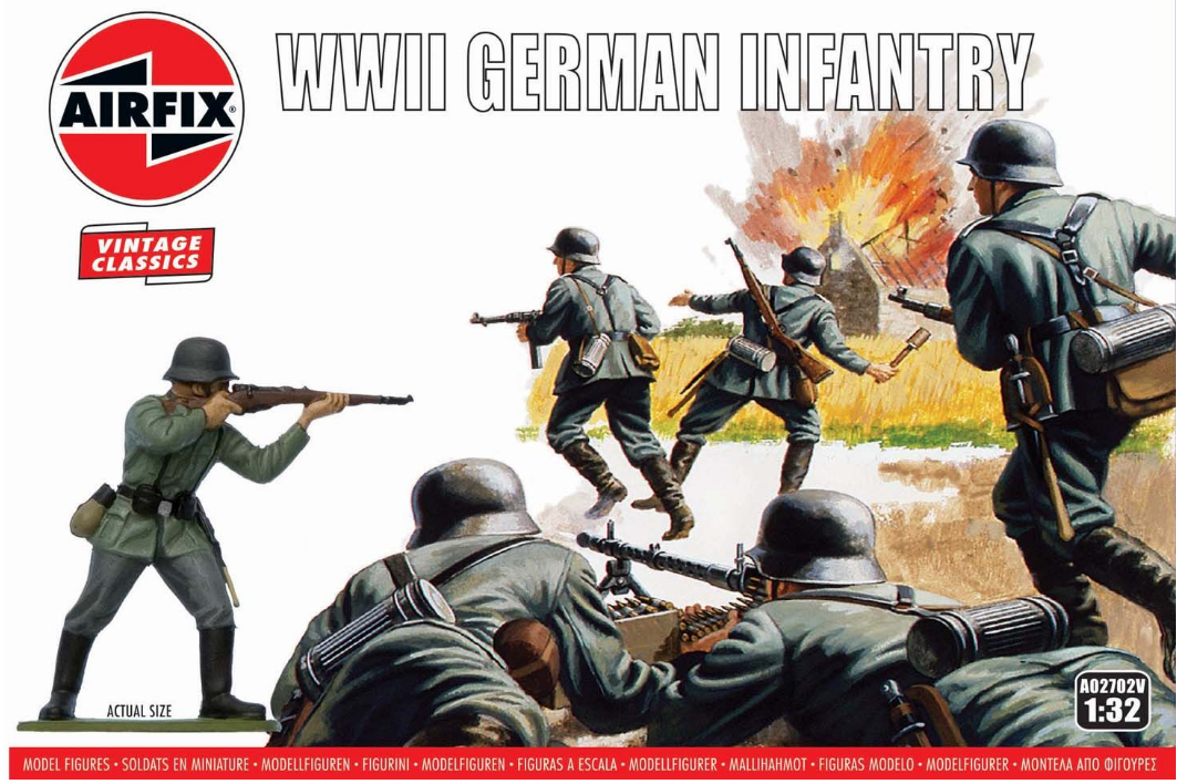A new 1/32 scale figure release for 2022 from Airfix. This set of German Infantry from WWII is highly detailed. The set features figures with various realistic poses, and each is equipped with different gear and weapons, such as K98 rifles, MP40 submachine guns, and an MG34 team.
