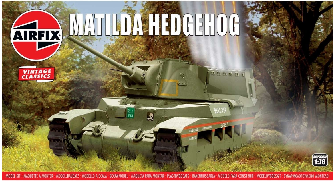 Based on the British Matilda tank it was fitted with a 7 spigot 'Hedgehog' naval mortar. The launcher folded horizontal, facing forward for travel, then could be raised up to 80 degrees for firing. It fired forward over the turret. Not being traversable, the driver had to aim the vehicle at the target.
