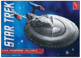 In 1996, the Enterprise-E made its first appearance in the film Star Trek: First Contact. The “E” shared many of the classic design elements of previous starships: twin nacelles, a saucer-like main section and torpedo-like engineering hull with deflector dish. This new version, however, featured a sleeker, more needle-like appearance, indicative of its advanced warp capabilities and enhanced weaponry. This DETAILED 1:1400 SCALE glue kit is 19″ long when assembled and includes decals and a display stand.