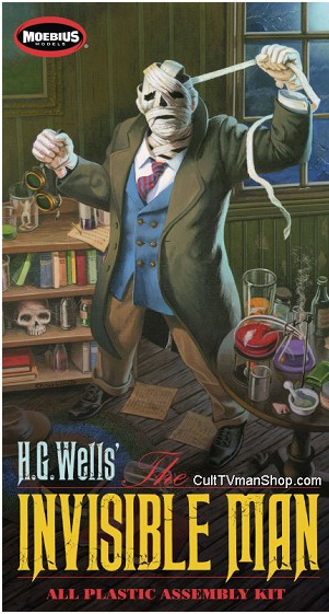 The Invisible Man is a MONSTER KIT from Moebius Models. Based on the classic H.G. Welles novel and designed by Chris White, this kit will feature approximately 95 parts. The dynamic figure comes with a table, bookcase and lots of cool lab stuff. This is an 1:8 scale Aurora styled design!