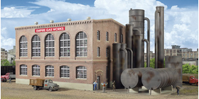 The Walthers Cornerstone Gas Plant with Washing Tank was a vital structure in the gas works. For over a century, the gas works was a fixture of American cities and towns. Long before natural gas and electricity were common, these facilities generated "coal gas" to power street lamps, home appliances and industrial machinery. The gas was actually a byproduct, made by baking coal to produce coke. Running night and day, a variety of fascinating machinery and structures were needed, along with plenty of rail service. After raw gas was recovered from the coke retorts, it was piped to the Gas Plant for cooling and cleaning. This required several pressurized steel tanks, each handling part of the process. As newer methods of producing and improving the energy output of the gas were introduced, the plant was modernized and larger tanks constructed alongside to handle increased production. Typical of a modernized operation, the new Gas Plant kit is a realistic blend of old and new. The kit is complete with a large main building featuring excellent brick detailing and older-style arched windows with realistic thin frames. Alongside you'll find a series of steel tanks that give the plant its unique identity and make it a natural addition to other industrial complexes such as steel mills. As shown the Gas Plant measures: 16-1/2 x 7-7/8 x 7-7/8" 41.2 x 19.6 x 19.6cm.