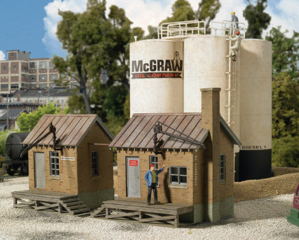 Businesses like McGraw Oil Company sold heating oil, diesel fuel and gasoline to consumers and dealers. Each had several storage tanks, a rack and piping for unloading tank cars and pumphouses for loading local delivery trucks. This Cornerstone Series kit is patterned after a typical trackside business and includes two different pumphouses with truck loading booms, four vertical tanks and a retention berm, tank car unloading rack and decals with a variety of business names. Dealerships like McGraw Oil Co. could be found in small towns and larger cities from the 1930s on, so this kit will look great on your steam- or diesel-era layout. See a selection of Cornerstone trackside businesses here.