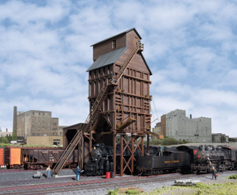 Based on a typical two-track design, the Walthers Cornerstone Wood Coaling Tower will be a focal point in any engine terminal. Towers like this were built in yards at servicing facilities as well as along the mainlines and branchlines to refuel engines on the road. This easy-to-build plastic model features a realistic coal bunker plus detailed chutes and mechanisms. A hopper unloading shed sits along one side for receiving coal. Like the prototype, it can serve two tracks at once, making it an ideal choice for maximizing service in minimum space. Place it in the vicinity of a roundhouse or engine shed, turntable, water tank and sand tower and you'll have a complete engine servicing facility for your railroad. The Wood Coaling Tower could still be standing in a late-steam or early-diesel era scene, a reminder of how things used to be.