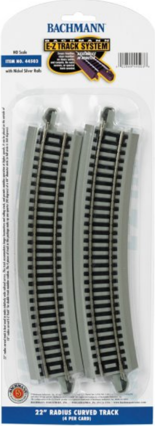 Nickel silver track with gray roadbed; 4/card 22” radius curved track is best used to make relatively wide railroad curves. This track accommodates longer locomotives and rolling stock, and permits mainline operation at higher speeds.