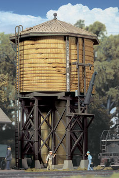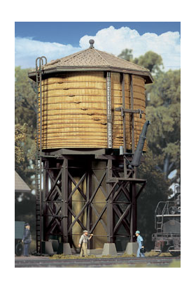 The Walthers Cornerstone Built-ups HO Scale Wood Water Tank is a typical wooden water tank based on those used on railroads from coast to coast. Constructed to satisfy steam locomotives' thirst for water, this fully assembled and decorated model adds instant steam-era realism to any layout. Appearing early in the 20th century, tanks like this were a fixture of railroad facilities until the last days of steam. It's perfect for busy engine terminals, small town yards and near smaller depots where engines were watered during the station stop. Fully assembled, the model features detailed wooden support timbers while the tank is molded in the same main color as other Trackside Built-up buildings. The spout on the Wood Water Tank can be moved to either the up or down position to add more action to any scene. Use the Wood Water Tank among other Cornerstone HO Scale railroad buildings.