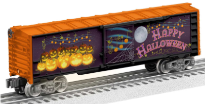 Grow your Halloween consist with this Illuminated Spooky Sounds Boxcar with glowing Jack-O-Lantern deco!